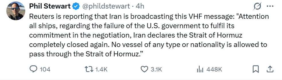 The Hormuz shuffle has turned into a truly incomprehensible dance. A mere day after Trump had exulted over the full reopening of the Strait, things have again slid into total disarray, with Iran in turn announcing Hormuz’s closure once again to stupefied and exhausted onlookers.