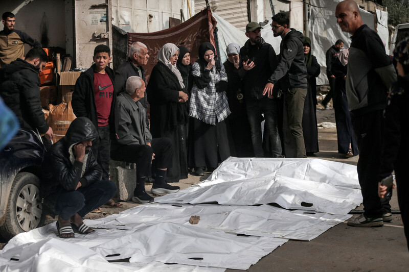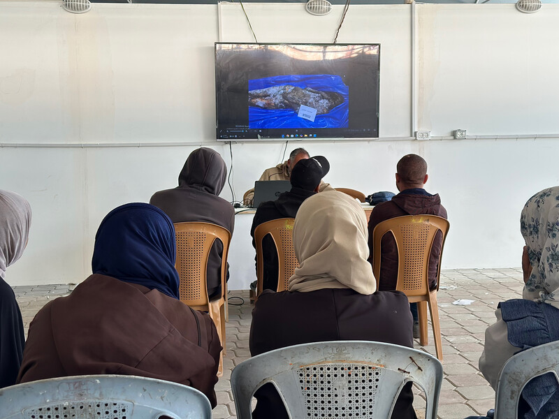 Palestinians look at photos of bodies in the hope of identifying missing family members after 15 bodies were handed over by Israeli authorities, Khan Younis, southern Gaza, 1 December 2025. Most of the returned bodies were unrecognizable. ActiveStills
