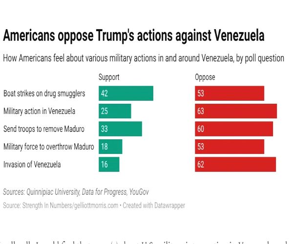Members of the president’s party seem happy with his nabbing of Maduro: Seventy-six percent of Republicans said they approved of his actions, compared to 13 percent who did not. Democrats, predictably, were dissatisfied. Thirteen percent of Democrats expressed their approval with his handling of Venezuela, while 77 percent disapproved. Independents, however, were broadly skeptical of the president’s actions: 48 percent said they disapproved of Trump’s Venezuela policy, with 39 percent expressing strong disapproval. Just 26 percent were in favor.