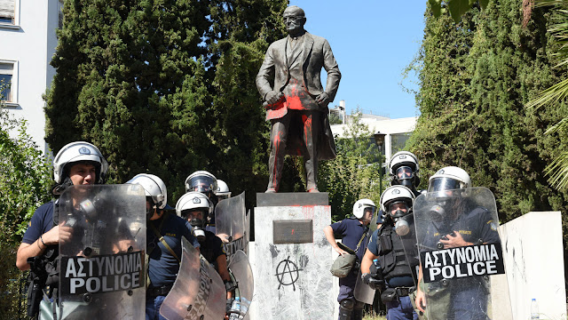 | Riot police… guarding the statue of Truman in Athens. |