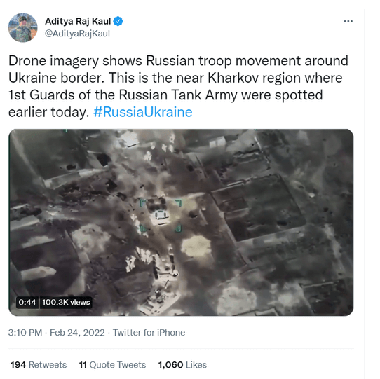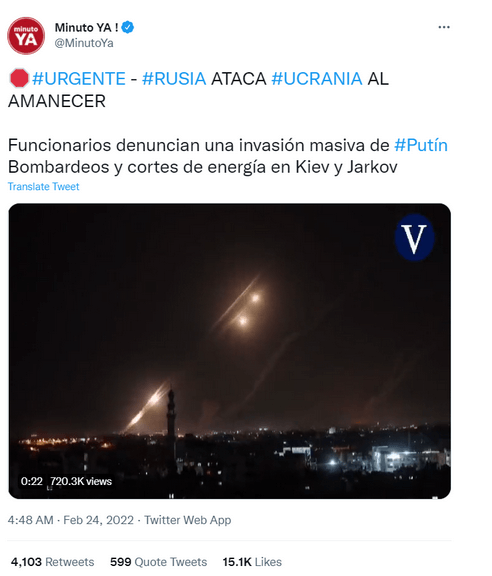MinutoYa, a verified (blue-ticked) Argentinian publisher posted a video, which remains up, with the caption: “#URGENT – #RUSSIA ATTACKS #UKRAINE AT DAWN. Officials denounce a massive invasion of #Putín. Bombings and power outages in Kiev and Kharkov.”