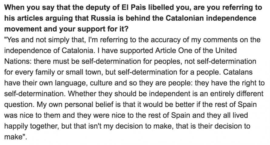 It appears that the crux of the issue relates to a Tweet posted by Assange in response to the arrest of Catalan President Carles Puigdemont in Germany at the behest of Spain. He drew a factual comparison between these recent events and the arrest of Lluís Companys, President of Catalonia in the 1940’s, who Assange accurately noted was arrested by the Gestapo – also at the request of Spain. Assange has been a consistent pillar of support for the Catalonian people, with his most recent statements on the matter specifying that he is not for Catalonian independence, but instead supports their right to self determination as a people: