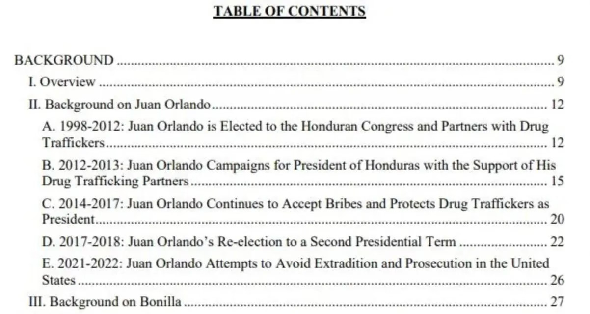 A screenshot shows the table of contents of the 2023 indictment of former Honduran President Juan Orlando Hernandez.