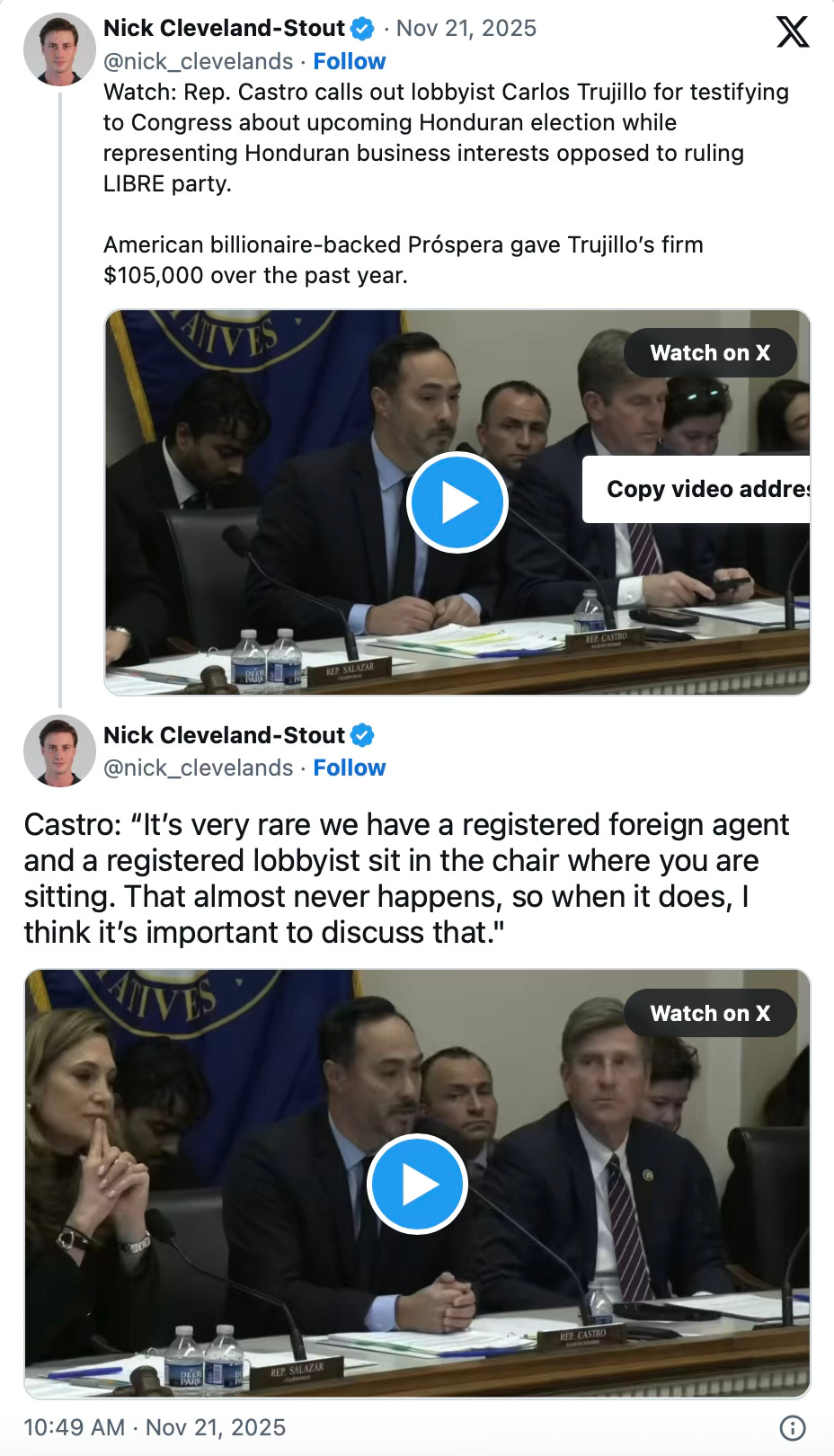 Throughout the session, Salazar teed up seemingly-scripted answers from a number of regime change operatives, including Trump’s first-term appointee as ambassador to the Organization of American States (OAS), Carlos Trujillo – who was exposed mid-hearing as a well-paid lobbyist whose Honduran clients strongly oppose the current government.